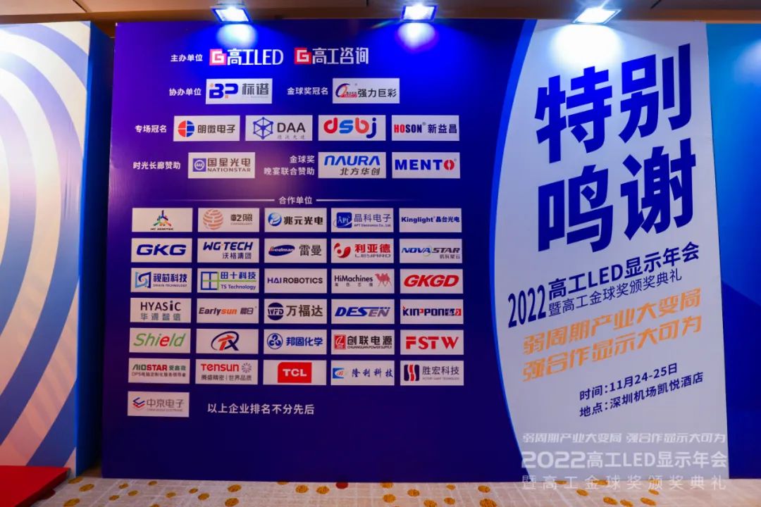 11月24日至25日,2022高工LED顯示年會暨高工金球獎頒獎典禮在深圳機場凱悅酒店盛大舉行。本屆年會覆蓋芯片、封裝器件、顯示屏、電視廠商、設(shè)備、IC電源、關(guān)鍵配套材料等顯示產(chǎn)業(yè)鏈,集結(jié)800+企業(yè)高層及行業(yè)精英,共話年度風(fēng)云,把脈行業(yè)發(fā)展趨勢。