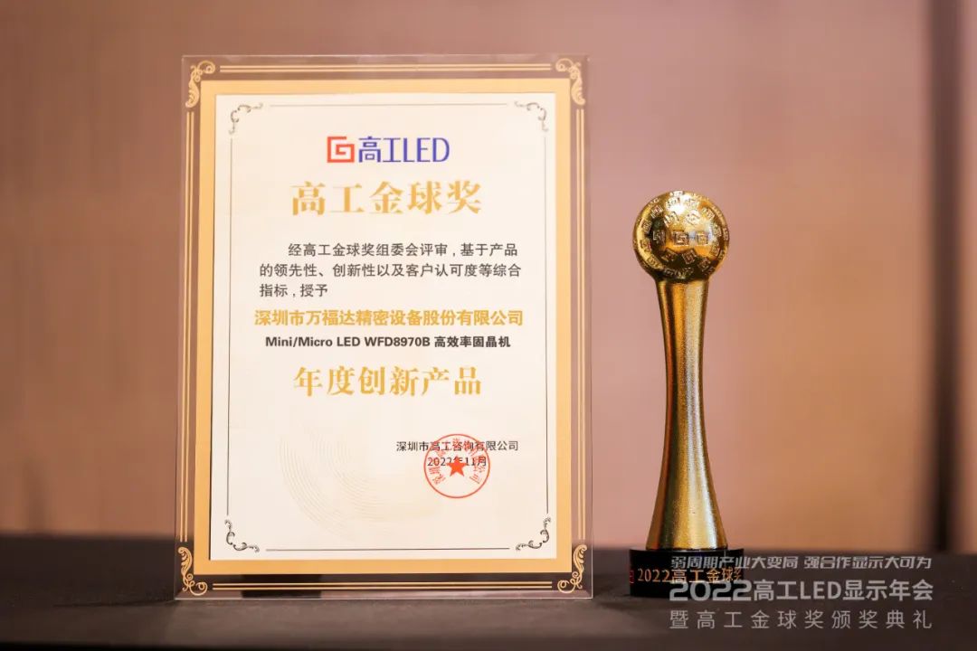 萬福達作為優(yōu)秀的Mini LED智能制造裝備供應(yīng)商,受邀出席本次大會,公司的WFD8970B高效率固晶機憑借其領(lǐng)先性、創(chuàng)新性以及客戶認(rèn)可,獲得了本次高工盛會的“年度創(chuàng)新產(chǎn)品”高工金球獎。